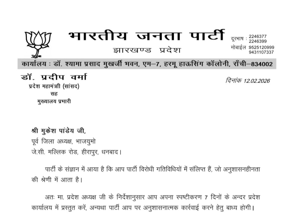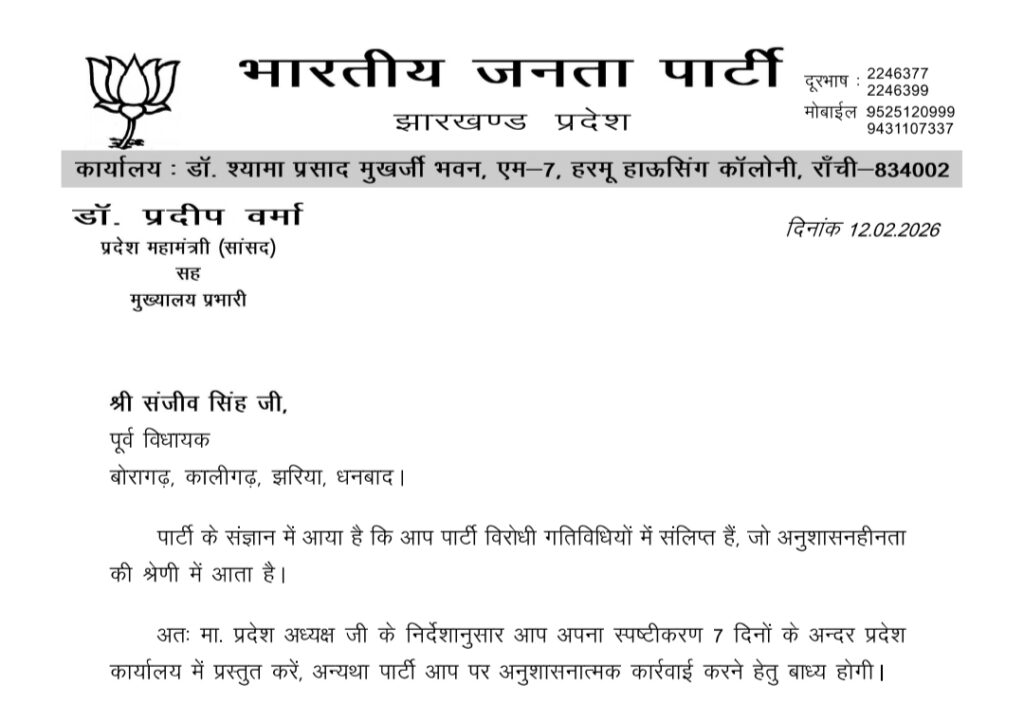 संवाददाता, धनबाद: धनबाद नगर निगम चुनाव के बीच भारतीय जनता पार्टी ने अनुशासन को लेकर सख्त रुख अपनाया है। पार्टी ने पूर्व विधायक संजीव सिंह समेत तीन भाजपा नेताओं को कारण बताओ नोटिस जारी किया है। यह नोटिस प्रदेश अध्यक्ष आदित्य साहू के निर्देश पर प्रदेश महामंत्री सह राज्यसभा सांसद प्रदीप वर्मा की ओर से भेजा गया है।